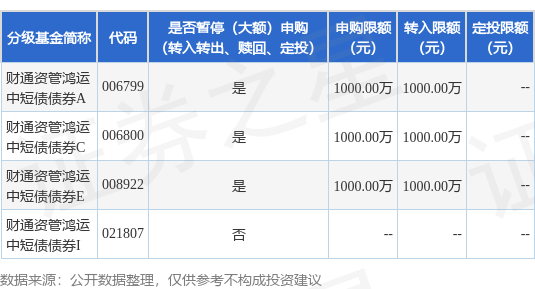 2025-10-29棋牌游戏,棋牌游戏平台,棋牌游戏APP下载证券之星消息,10月29日财通证券资产管理有限公司发布《财通资管鸿运中短债债券型证券投资基金暂停大额申购、转换转入、定期定额投资业务公告》。公告中提示,为维护财通资管鸿运中短债债券型证券投资基金的稳定运作,保护基金份额持有人的利益,自2025年10月29日起财通资管鸿运中短债债券型证券投资基金暂停大额申购、转换转入、定期定额投资业务,申购、转换转入上限金额为1000.0万元,下属分级基金调整明细如下: