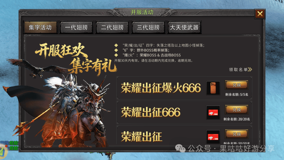 荣耀3区开服福利重磅加码,助力萌新快速领跑!新注册即送30天庆典起步套装,药水、传送符管够;7天登录礼重置升级,第7天必得强力宠物小恶魔(攻击+30%),前6天每日领取随机符与药水,前期输出、跑图无忧。等级冲刺奖励层层递进,100级领龙王套装体验版,200级解锁天使之战坐骑,400级永久提升字卡掉率10%。更有集字赢豪礼活动,收集“荣、耀、出、征、6、爆、火”字卡,可兑换购物卡,集齐全套还能抽iPhone17,全服3个幸运名额静待归属!